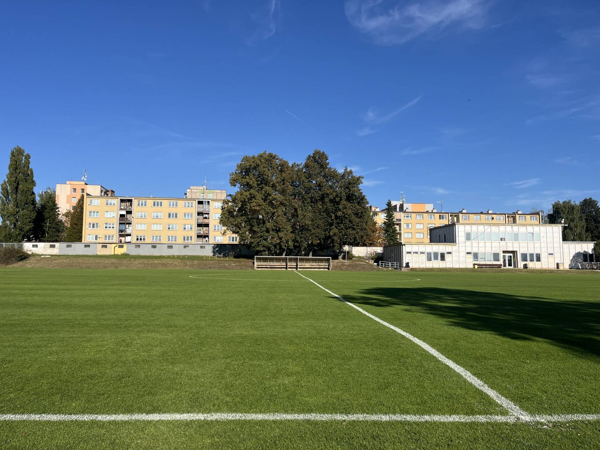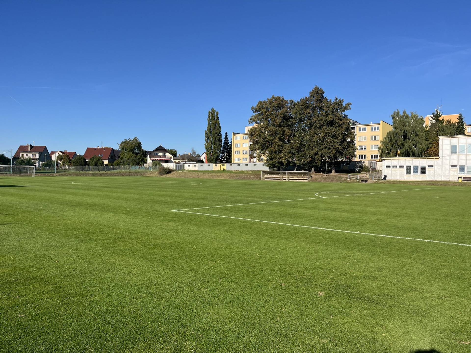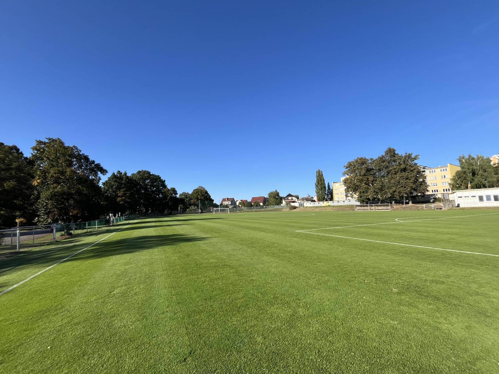 Travnaté fotbalové hřiště s odlehčovací plochou s rozměry 98 x 72 m a 78 x 60 m.