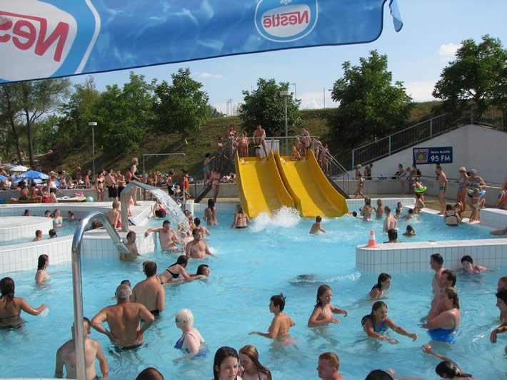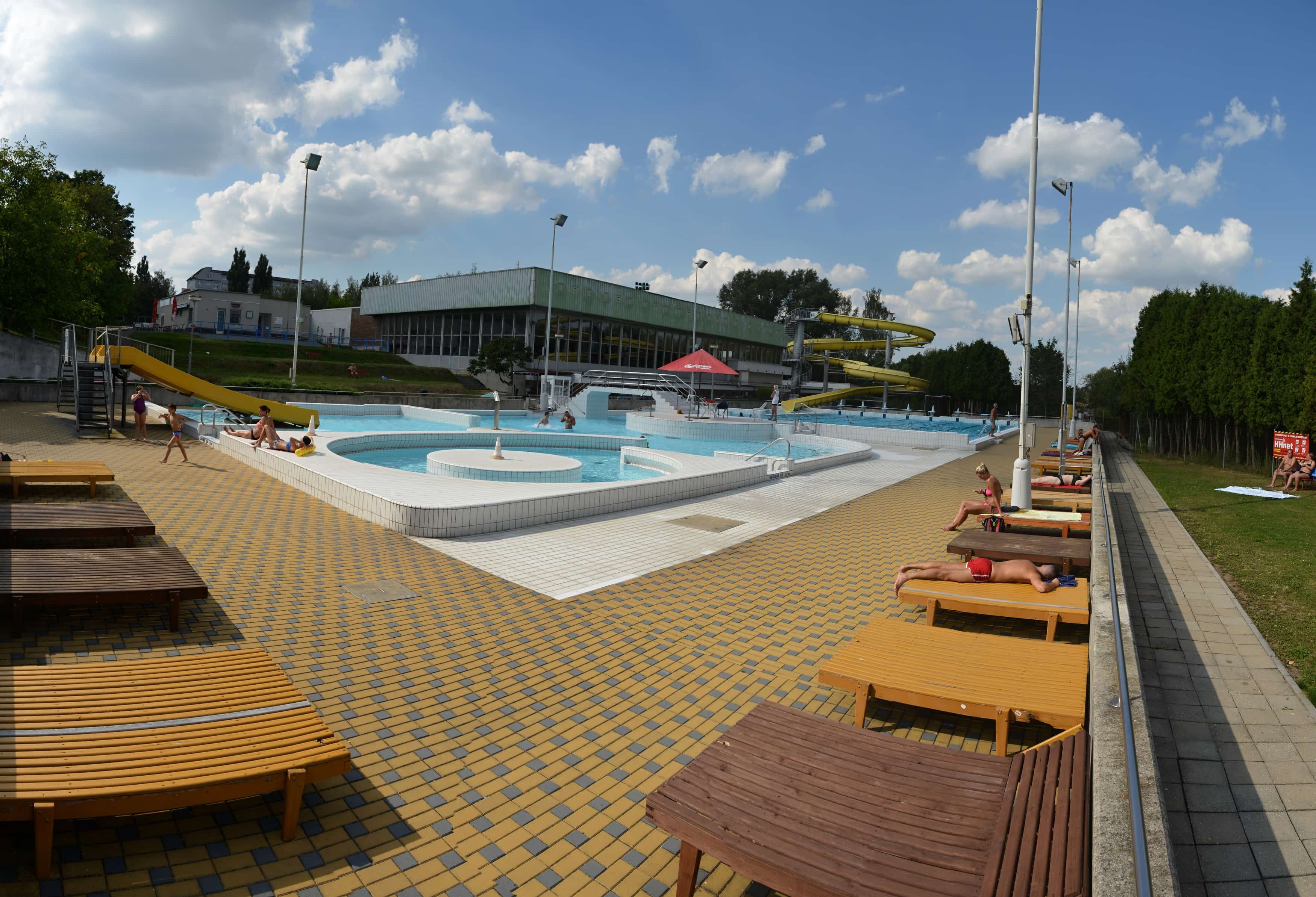 Tobogán zdarma. Venkovní bazén 920 m2 vodní plochy, hloubka 0,8 – 1,8 m, objem vody 1 470 m3, kapacita 1150 osob.