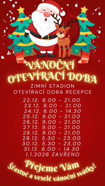 Provoz recepce během vánočních svátků na Zimním stadionu 19.12.202519.12.2025 autor: Eva Oupicová Během vánočního období jsem na recepci pro vás na zimním stadionu. Přejeme Vám šťastné a veselé vánoční svátky! Tým TZMT.